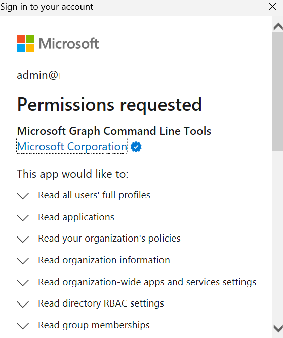 If you are authenticating with the Microsoft Graph Client ID for the first time, you will be prompted to grant the necessary permissions, as shown below: